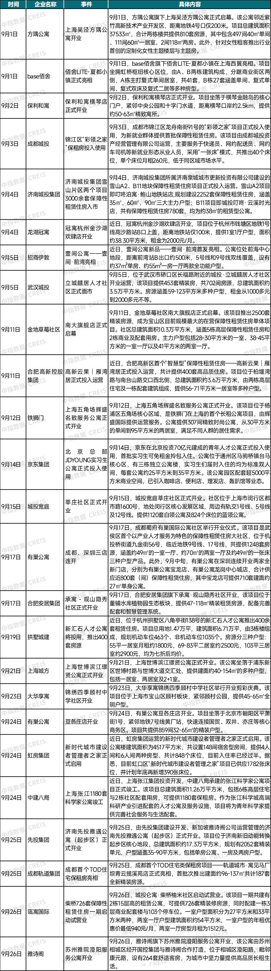 9月,地方国企筹建的保租房与人才公寓项目集中上市,如成都城投的锦江区“彩领之家”保租房、济南城投集团的雪山A2、B11地块保租房、武汉城投的立城囍居人才社区、合肥高新控股集团的高新云果│雁湾居等。同时,龙湖冠寓、招商伊敦、华润有巢等专业化长租公寓运营商也推出多个市场化长租项目,如冠寓杭州金沙湖欢肆店、招商伊敦壹间·前湾、华润有巢的成都蜀府有巢国际公寓社区等。