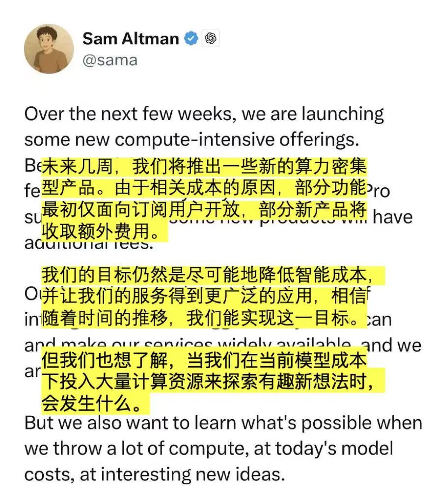 OpenAI CEO山姆·奥特曼此前刚抛出消息:未来将推出系列算力密集型新产品,并收取额外费用。