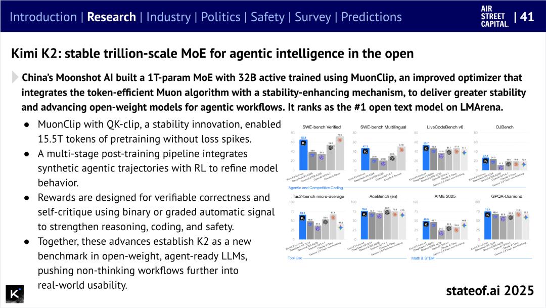 随着AI行业进入高消耗的”生产力竞争时代”,中国模型正在凭借”高性能+低成本”的组合拳逐渐赢得更多全球市场份额。这一趋势背后,离不开中国大模型产业在算法创新上的系统性突破。在2025年度的stateof.ai权威行业报告上,来自中国的DeepSeek-V3系列和Kimi K2系列成为与OpenAI-o1系列并列的全球三个代表性基础技术突破模型。