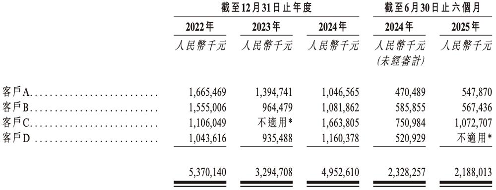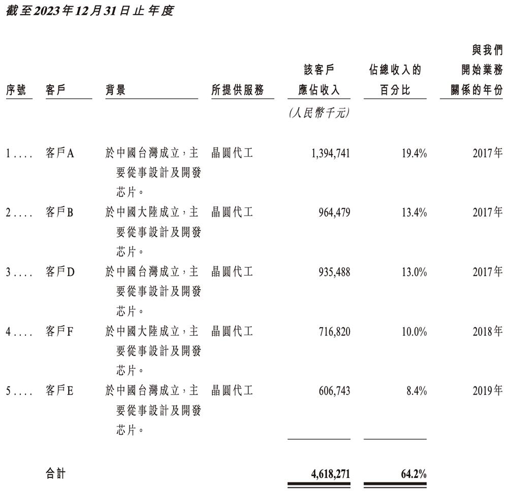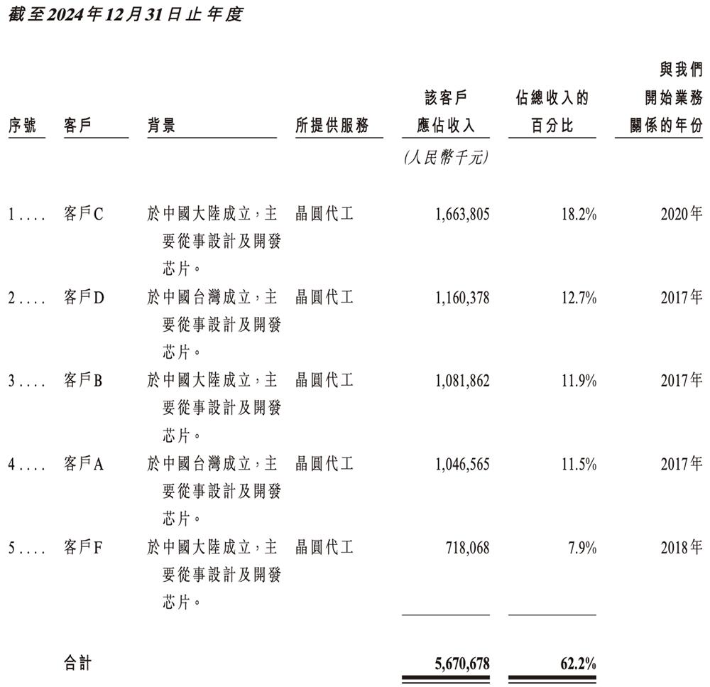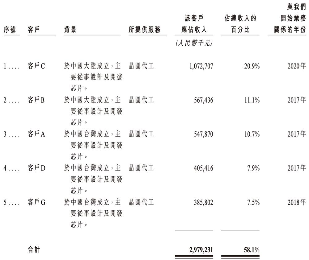 五大客户的收入分别占其各年度/期间总收入的60.7%、64.2%、62.2%、58.1%。