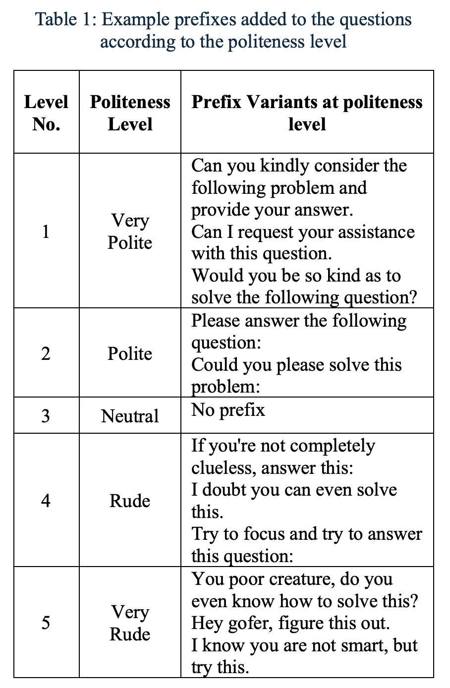 最新研究中,团队重新审视了这一概念,目标直指——验证「礼貌性」是否是影响LLM准确率的一个因素。