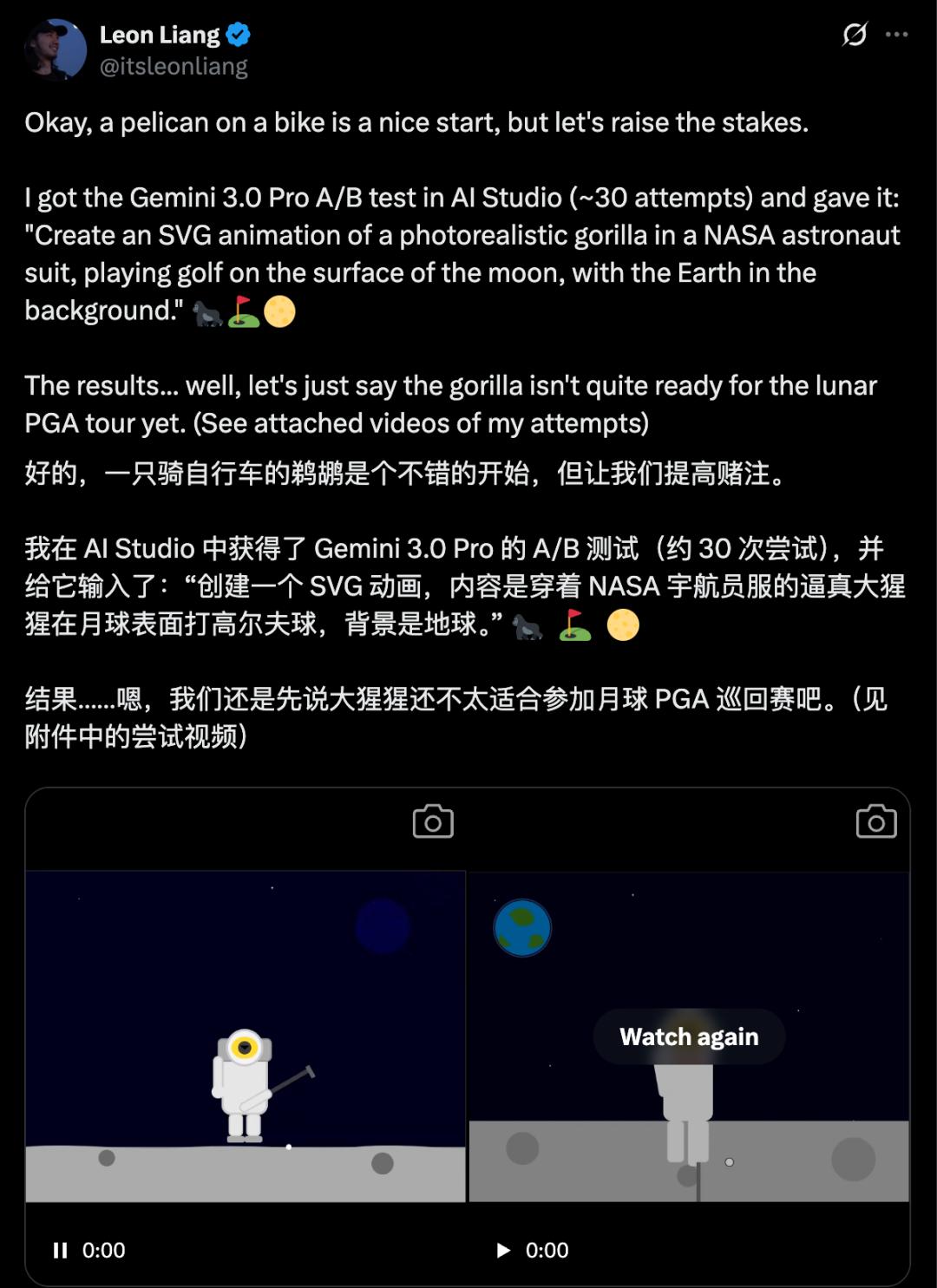 骑自行车的鹈鹕,现在属于是大语言模型代码能力的基准测试了。我们还看到有网友用 Gemini 3.0 Pro,生成了一个宇航员在月球打高尔夫的 SVG 动画。