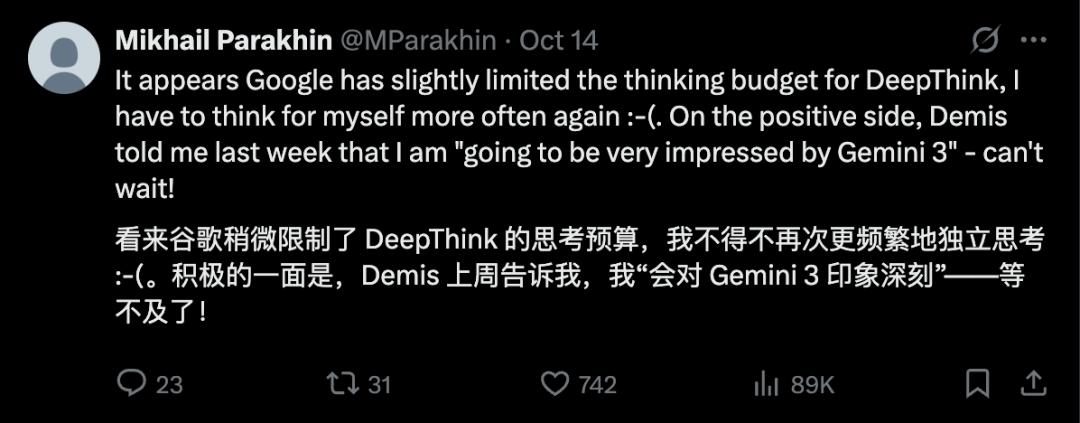而关于 Gemini 3 能力如何,目前唯一来自官方的确认,也只有 Mikhail 发布的这条推文,他说 Demis 上周告诉他,Gemini 3 会让人印象深刻。