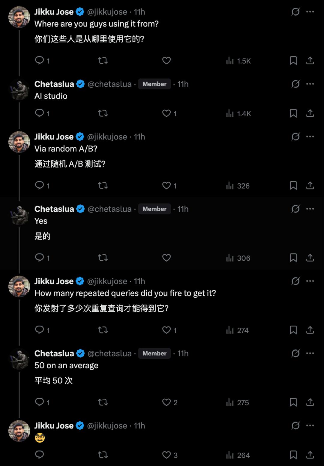 这些网友也是不断地在 AI Studio 里面疯狂输入提示词,直到 AI Studio 给出了两个不同的回答,然后默认更好的那个就是 Gemini 3,甚至 Gemini 3.0 Pro、Ultra 等版本。