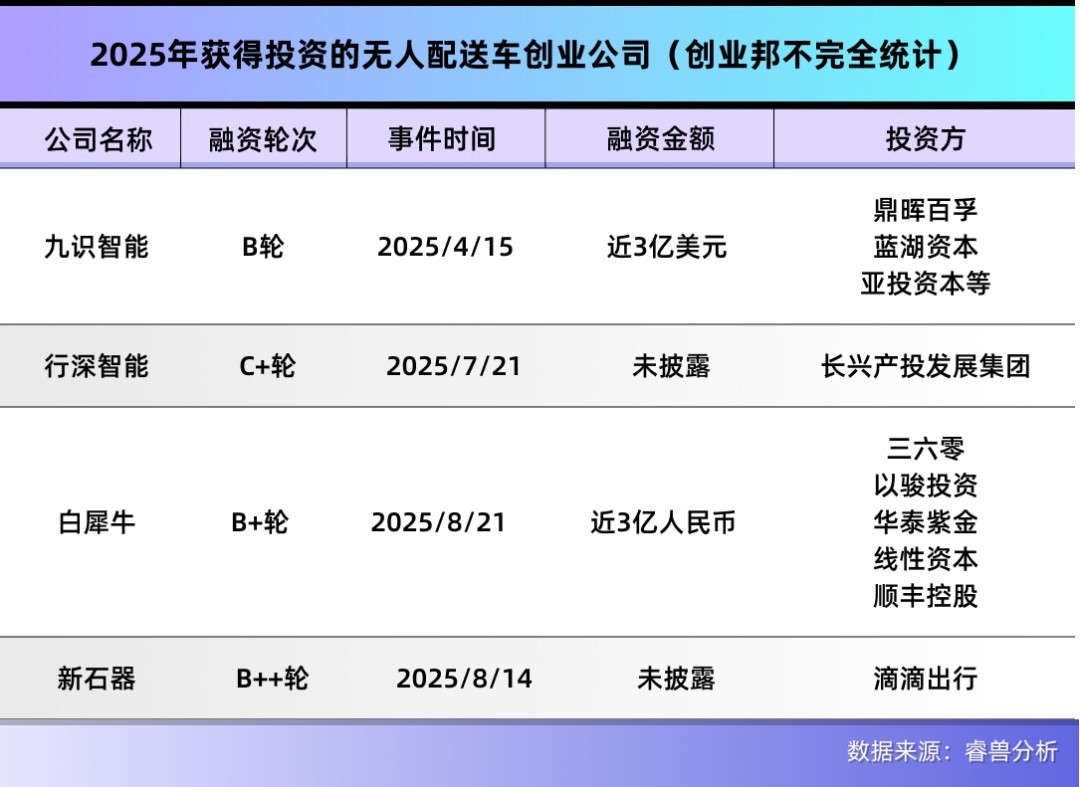 目前,九识智能已完成了3轮融资,2025年获得近3亿美元B轮投资,投资方包括亚投资本、鼎晖百孚、蓝湖资本、BV百度风投等。