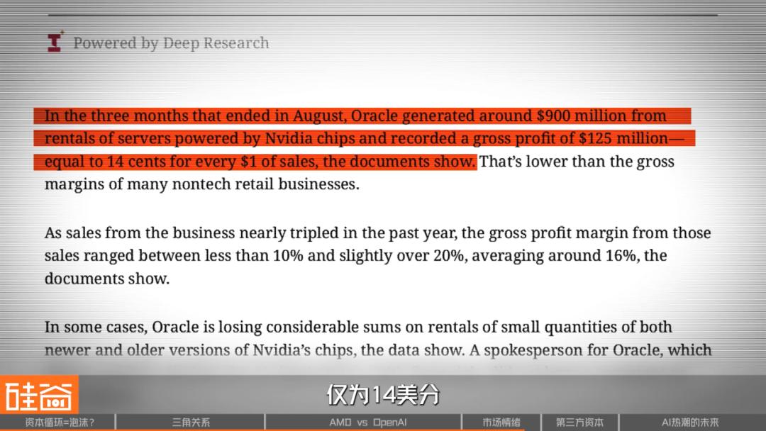 根据《The Information》援引的内部文件,甲骨文在最近一个季度通过租赁搭载英伟达芯片的服务器,获得了约9亿美元的营收,但其每1美元销售额的毛利仅为14美分。