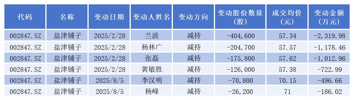 值得关注的是,公司高管层年内已多次“组团”减持,盐津铺子四位副总经理兰波、杨林广、黄敏胜、张磊曾“组团”抛出减持计划,公司副总经理李汉明和财务总监杨峰也加入减持大军