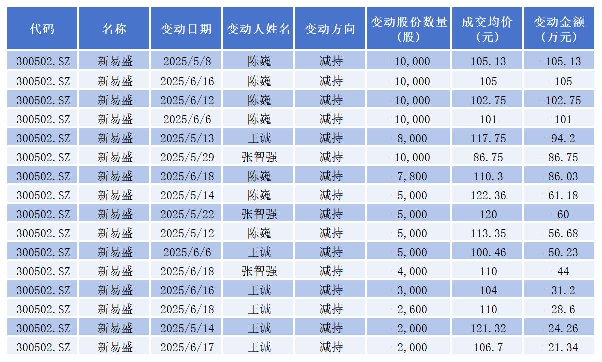 值得关注的是,公司其他高管今年也进行过一次集中减持。今年4月,新易盛公告披露,因个人资金需求,公司副总经理陈巍,副总经理、董事会秘书王诚以及监事张智强计划在三个月内合计减持不超过8.1万股公司股份。减持期届满,陈巍减持金额为617.77万元,王诚减持金额为249.84万元,张智强减持金额为190.74万元。