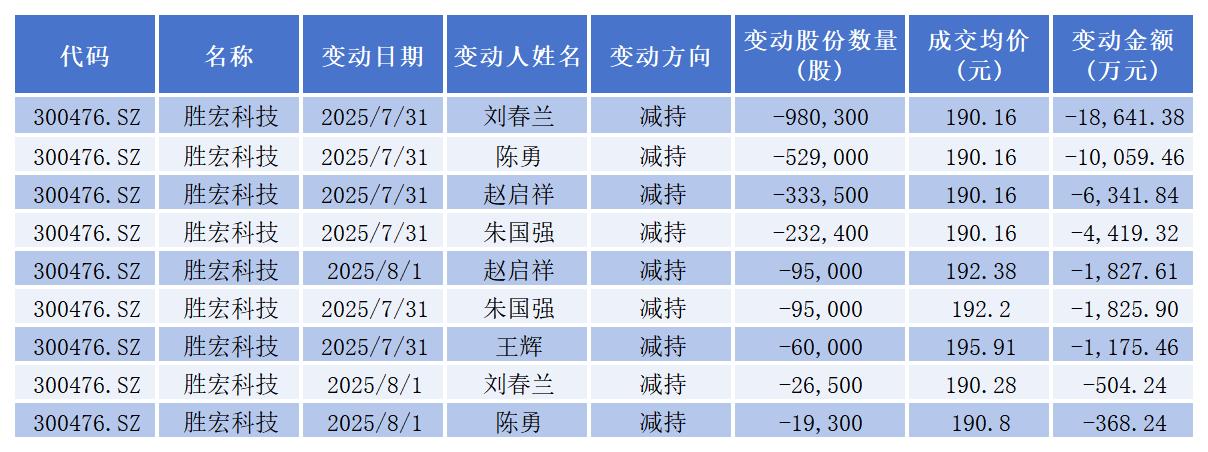 7月-8月,胜宏科技创始人陈涛配偶刘春兰、总裁赵启祥、副总裁陈勇、执行副总裁王辉、财务总监朱国强已完成减持计划,合计减持237.12万股(占总股本0.2765%),合计套现超4.51亿元。其中,刘春兰套现1.91亿元、赵启祥套现8171.01万元、陈勇套现1.04亿元、王辉1175.46万元、朱国强6246.76万元。