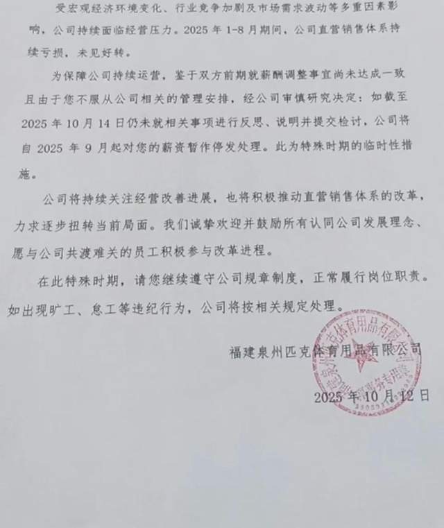 10月13日,多个媒体报道称,有相关员在社交媒体上透露匹克公司向拒绝降薪的员工发出“最后通牒”,要求其在10月14日前提交“反思检讨”,否则将面临停发9月份工资的处罚,并且还贴出了盖了匹克公司红章的文件。