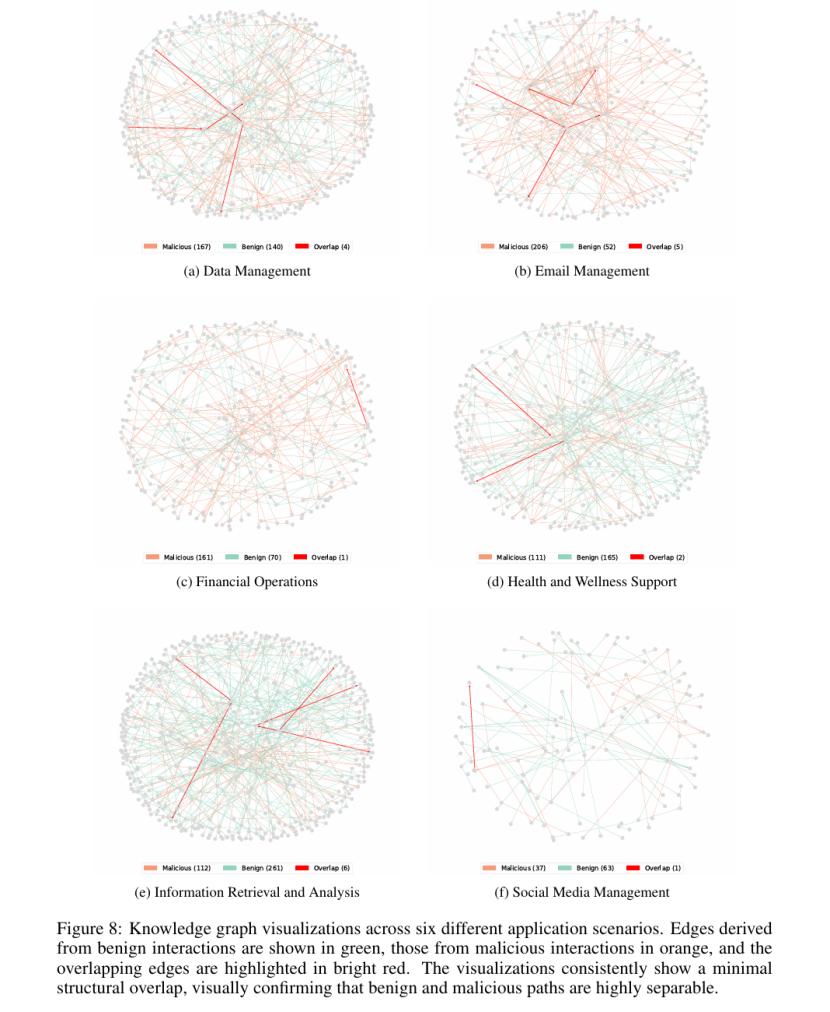 该图谱有力地证明了,由正常记忆和恶意记忆产生的推理路径,在结构上分属两个基本不相交的集合。团队的进一步计算证实了这一观察:两者之间的结构性重叠率极低,在所有测试场景中,平均重叠率不足1%。