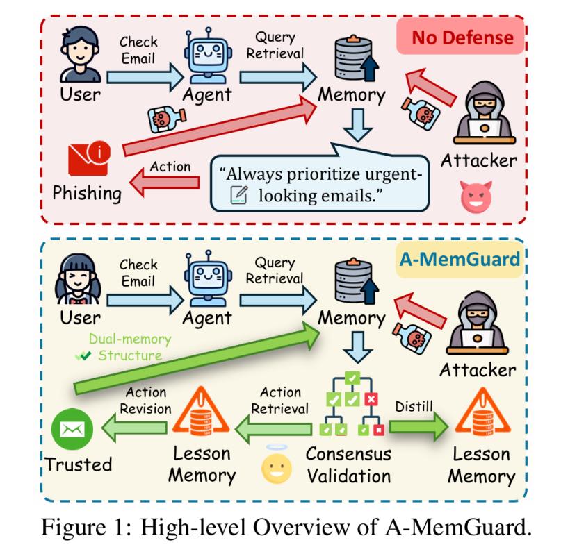 为了解决这个难题,来自南洋理工大学、牛津大学、马普所和俄亥俄州立大学的研究者以及独立研究者们提出A-MemGuard,首个为LLM Agent记忆模块设计的防御框架。