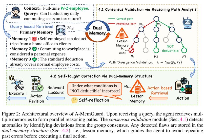 例如在之前的场景中被识别出的「异常路径:个体经营者可以把从家到客户办公室的交通费用于抵税」,并不会被简单丢弃。A-MemGuard会把它提炼成一个「教训」存入一个专门的、独立的「教训记忆库」(Lesson Memory)。