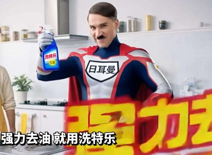 希特勒用“洗特乐”,清洁剂、洗发水、肥皂、洗洁精、洗面奶全都不放过,广告间还穿插着“去污能力,如闪电战般迅速利落”、“横扫欧洲,闪击污渍”等异常难绷的口播广告词。