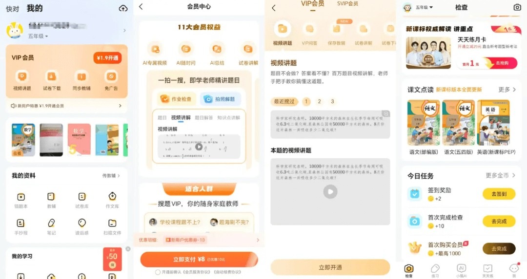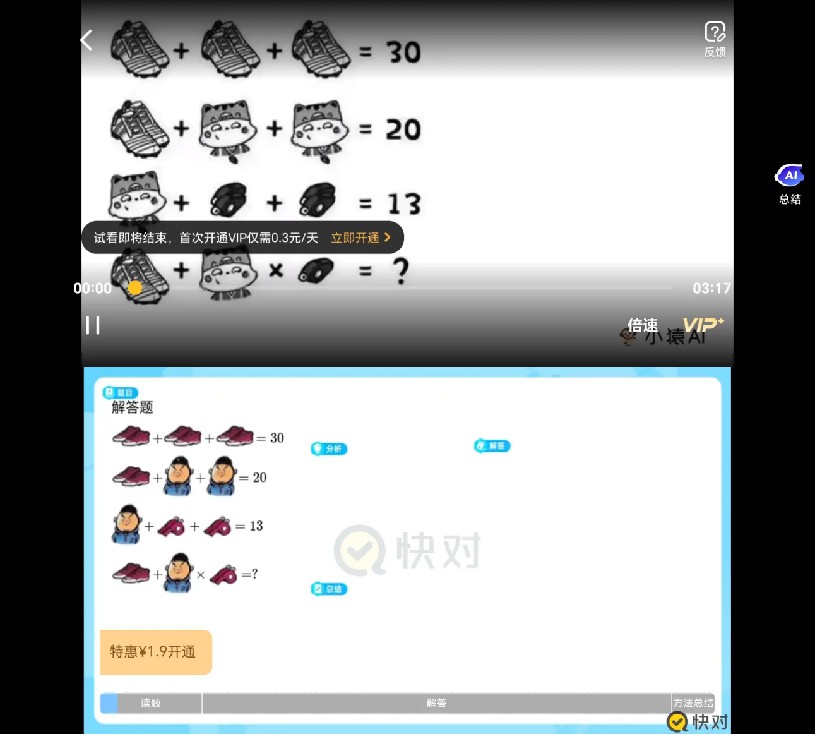 从回答准确率来看,除“豆包爱学”出现识别不清的问题外,其他产品都给出了正确的文字答案。但在点击视频讲解时,只有“夸克学习”能免费观看,其余均需开通会员。这一差异正体现出两类公司的不同定位:教育大厂追求变现,互联网大厂强调引流。