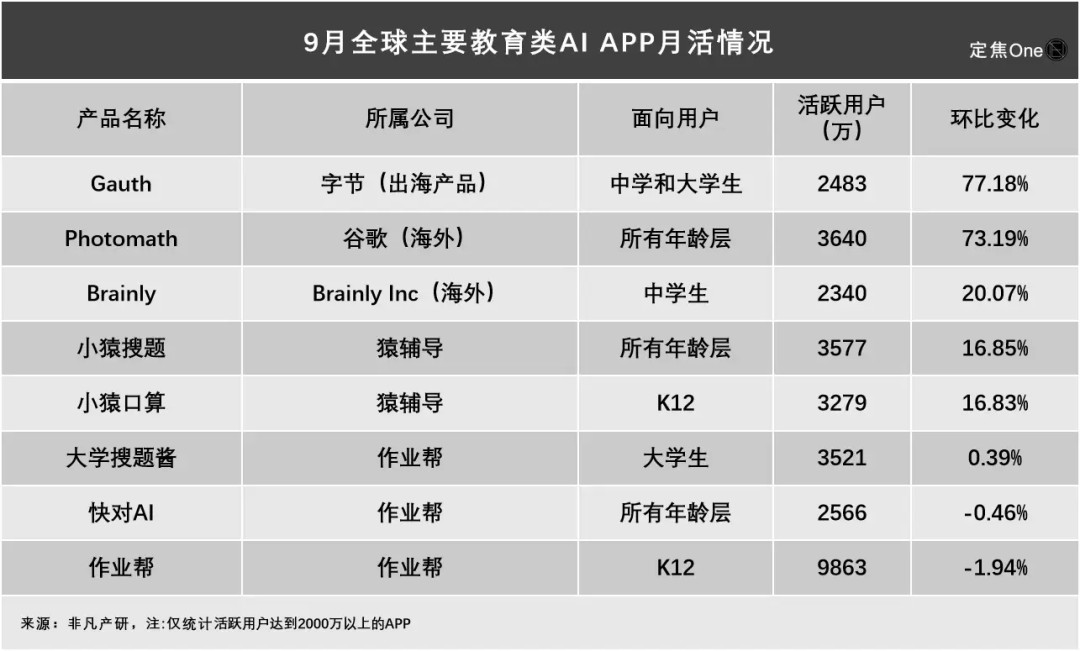 从榜单数据来看,9月活用户超2000万的教育类AIAPP共8款,其中增速最快的是字节的Gauth