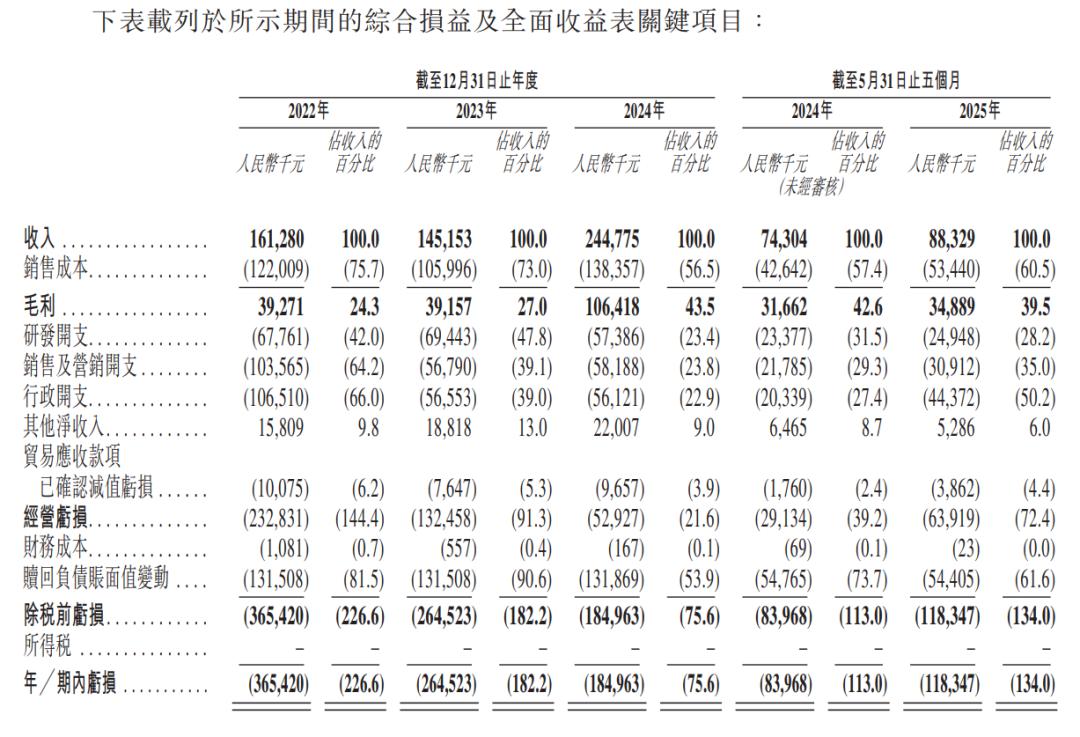招股书显示,2022年至2024年以及2025年前5个月,云迹科技的收入分别约为1.61亿元、1.45亿元、2.45亿元,以及0.88亿元。报告期内,毛利分别约为0.39亿元、0.39亿元、1.06亿元,以及0.34亿元;毛利率分别为24.3%、27.0%、43.5%,以及39.5%。