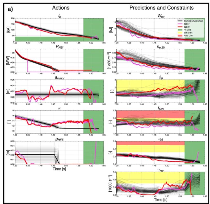 在一次编号为 #81751 的放电中,这一现象导致了等离子体的突然偏移与终止。研究团队据此在强化学习(RL)环境中引入间隙误差的不确定性分布,使轨迹在训练中主动适应不确定性。结果表明,经过重新优化的轨迹(#82875)在相似误差条件下依旧保持稳定。这一改进展示了模型从真实误差中学习鲁棒性的能力,也证明了数据驱动优化在安全约束条件下可实际提升装置运行的容错性。