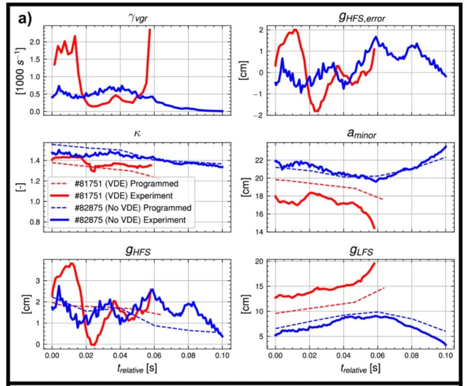 在所有实验中,最具启发意义的两个结果分别来自对「控制误差敏感性」的鲁棒性验证与「预测先行」外推测试。前者揭示了缓降阶段的一个脆弱点——当高场侧间隙出现微小偏差时,垂直不稳定增长率可能出现数量级放大,从而触发垂直位移事件(VDE)。