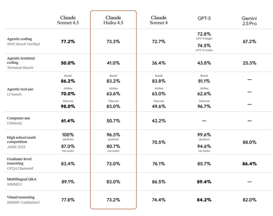 在整体的基准测试结果中,Claude Haiku 4.5在多个任务重表现超过Claude Sonnet 4,这意味着基于该模型的浏览器Agent插件Claude for Chrome等工具会比以往任何时候都更快、更有用。