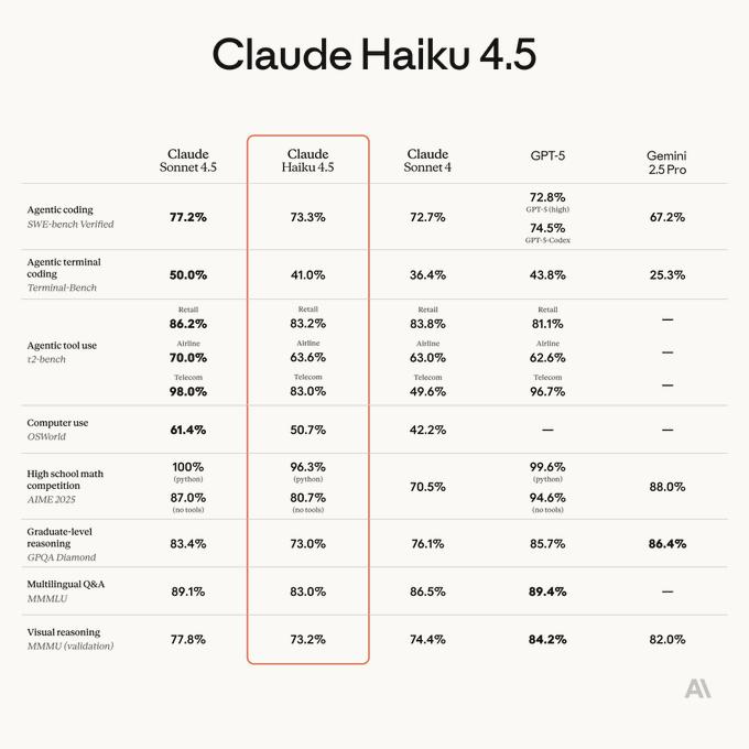 Anthropic 表示,这款模型速度更快,性能甚至优于数月前还被视为行业前沿的其他大型模型。例如,在计算机使用能力上,Claude Haiku 4.5 优于该公司 5 月推出的中型模型 Claude Sonnet 4。而在代码生成能力方面,根据用于测试 AI 系统软件编码能力的数据集 SWE-bench Verified 显示,它的表现与 Claude Sonnet 4 以及 OpenAI 最新模型 GPT-5 相近。