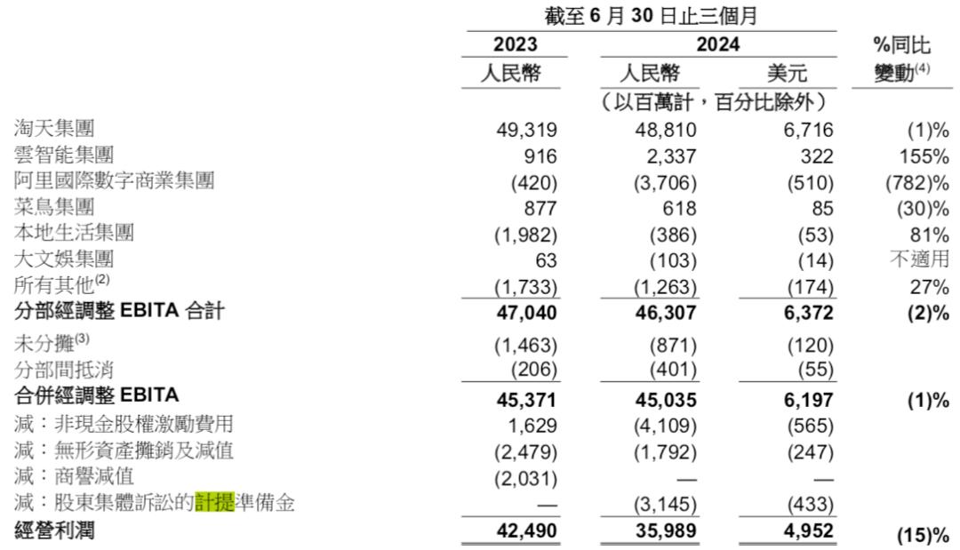 再比如,阿里巴巴在自然年2024年6月的Q2财报中,计提了31.45亿元、合4.33亿美元的股东集体诉讼准备金,在经调整EBITDA利润明细中进行了说明。它属于日常经营业务之外的事项,但对经营利润产生影响。此事主要涉及与美国投资者的一项协议和解支付,阿里在财报中计提这笔费用时尚未就此付款。