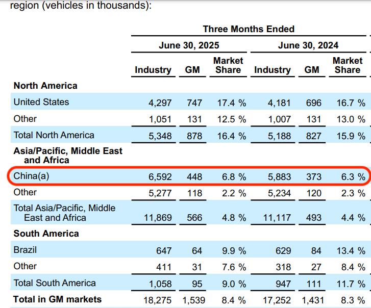 根据Q2财报,通用中国市场销量同比增长20%,达44.8万辆,通用在中国市场的销量份额也从2024年Q2的6.3%微升至2025年Q2的6.8%,分析认为是由于上汽大通的增长和别克的新能源转型拉动。而Q2中国市场销量在通用汽车整体占比是29%,同比有所提升,这个是数量占比而非销售额占比。
