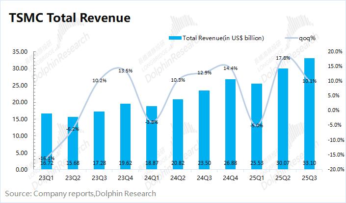 台积电在2025年第三季度实现营收331亿美元,超出公司此前指引区间(318-330亿美元)。本季度收入环比增长10%,主要受手机业务和AI芯片增长带动,以及汇率变化的影响。若从新台币口径看,公司本季度收入环比增长6%,符合指引区间。